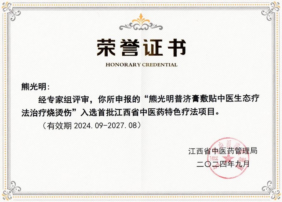 熊光明先生凭借其在科技兴医、开拓创新方面的突出贡献,先后荣获“国家科技成果”、“江西省名中医”、“江西省省级D类高层次人才”及“庐陵工匠”荣誉称号。其主持研发的“普济膏敷贴中医烧伤生态疗法”入选首批江西省中医特色疗法,并成为江西洪都药业有限责任公司首个成功注册投产的创新产品——普愈puyu创面敷贴的技术来源和研发基础。