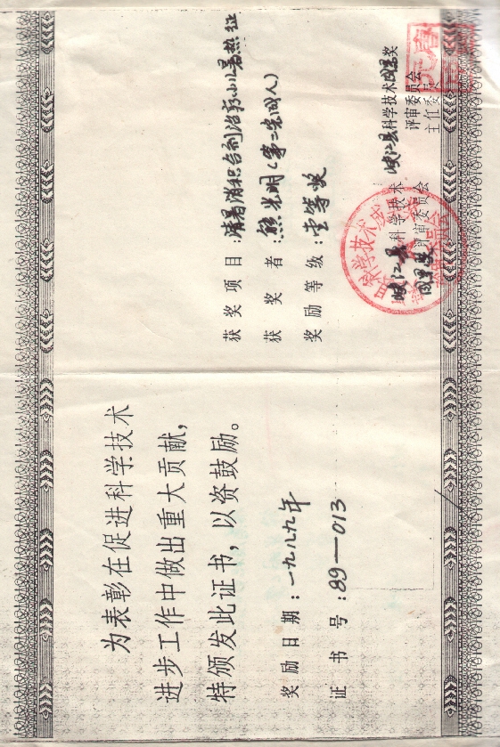 1、1989荣获县科技进步一等奖